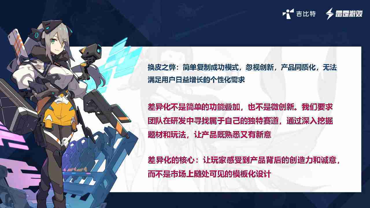 在我们内部是这么定义差异化的。。首先,,,差异化不是简单的功能叠加,,更不是换皮。。。只是换皮,,,,产品无法提供有效的市场价值。。。。内部经常说差异化的产品不是为了迎合市场,,而是找到一个自己独特的表达方式,,在研发中找到属于自己的细分赛道和独特赛道,,,,前提是需要对这个题材有足够的深入、、挖掘,,,对玩法有足够深入的理解,,,,让产品看起来既熟悉又有新意。。