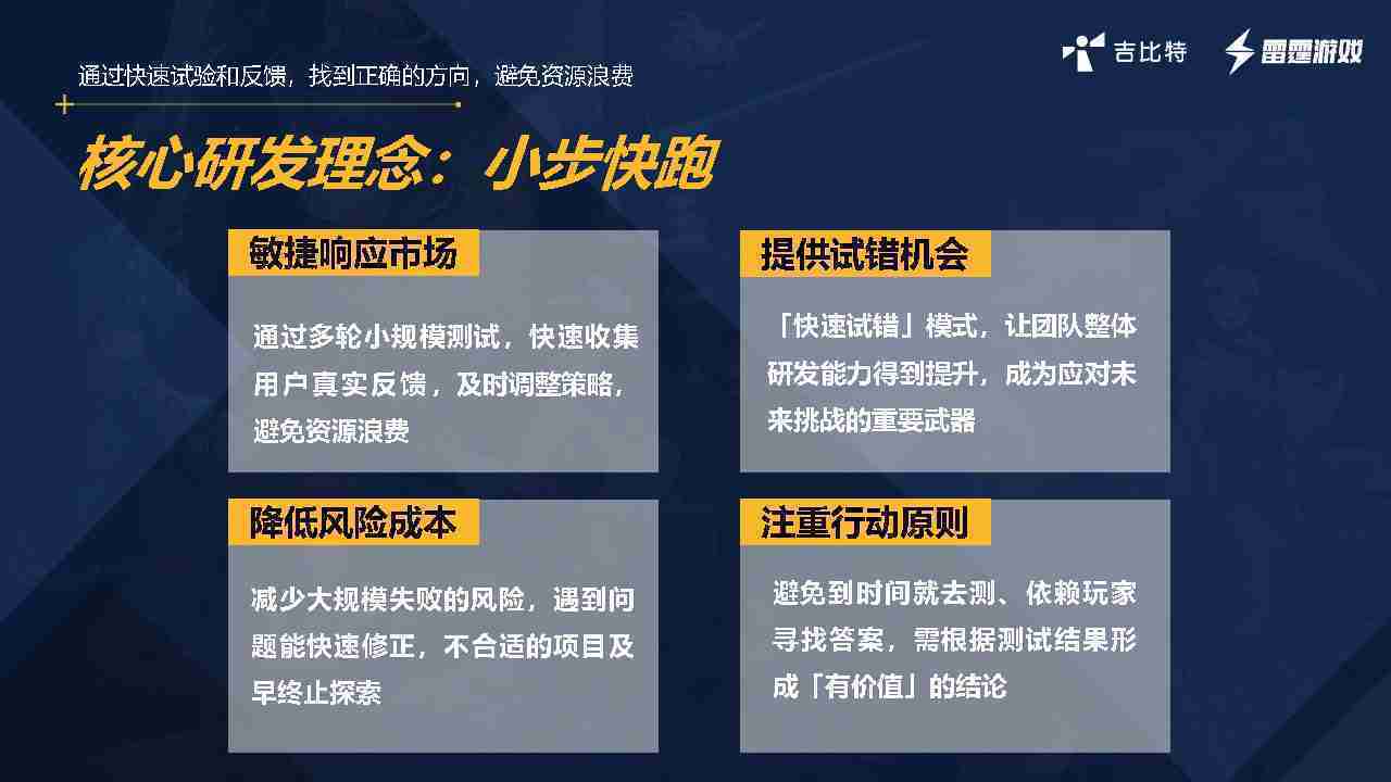 小步快跑不是找答案,,,,而是验证答案。。我们之前有项目是这样的,,,有些制作人会有几个方向觉得都可以做,,,但是不确定做哪一个,,,会选择几个都做,,,,做完拿到市场跑,,,,跑出哪一个更好,,,基于这个再做后续的研发和拓展。。但这种情况最容易出现一个问题,,可能被玩家裹胁,,,玩家说这个点不错、、那个点不错,,,,到底听还是不听,,不听感觉是无视玩家的反馈,,听的话,,可能自己没想清楚导致研发思路发生偏颇。。。。所以针对这一点后面自己复盘整理,,,,发现制作人自己心里要有数,,,要做自己觉得好玩的,,而且明确知道这个东西是你想做的,,,,然后拿到市场验证这个答案是不是对的,,而不是拿一堆答案找哪一个答案更好。。。